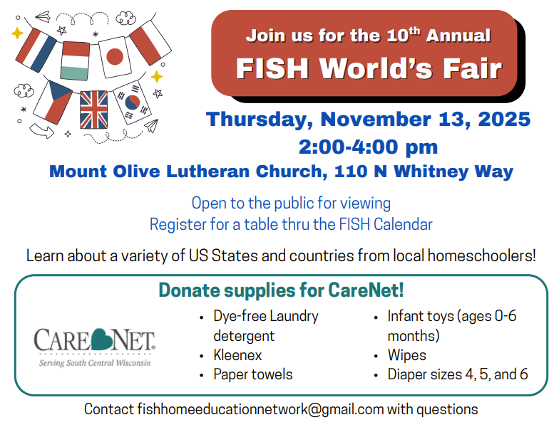 Our World's Fair is hosted by FISH Families who have learned about a country or state. Upon arriving, you will be given a Passport with a number of questions that each family should know the answer to. Each country will also have a food/snack and an activity. Upon leaving, those who explored our countries will also receive a small gift of their choice.